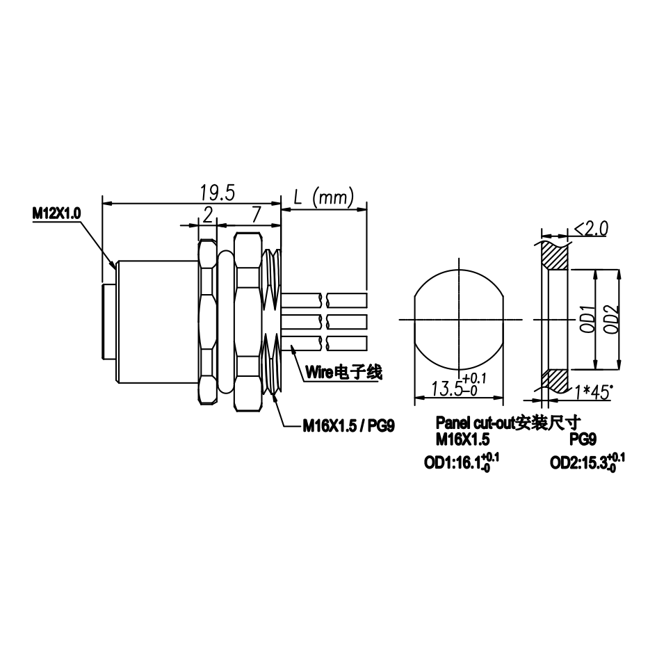 M12 母头面板式,焊接式,后锁安装,焊电子线
