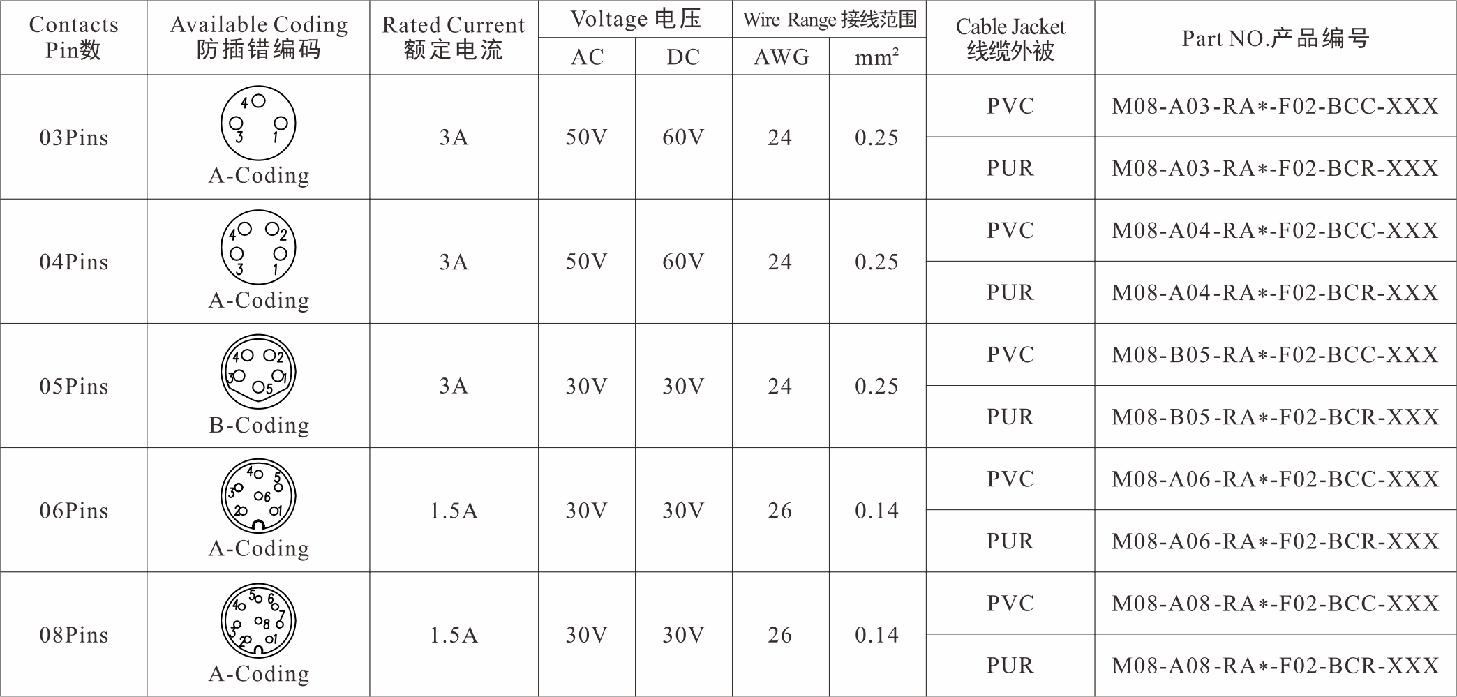 Part No 产品编码:M08-X**-RA0-F02-BC*-XXX