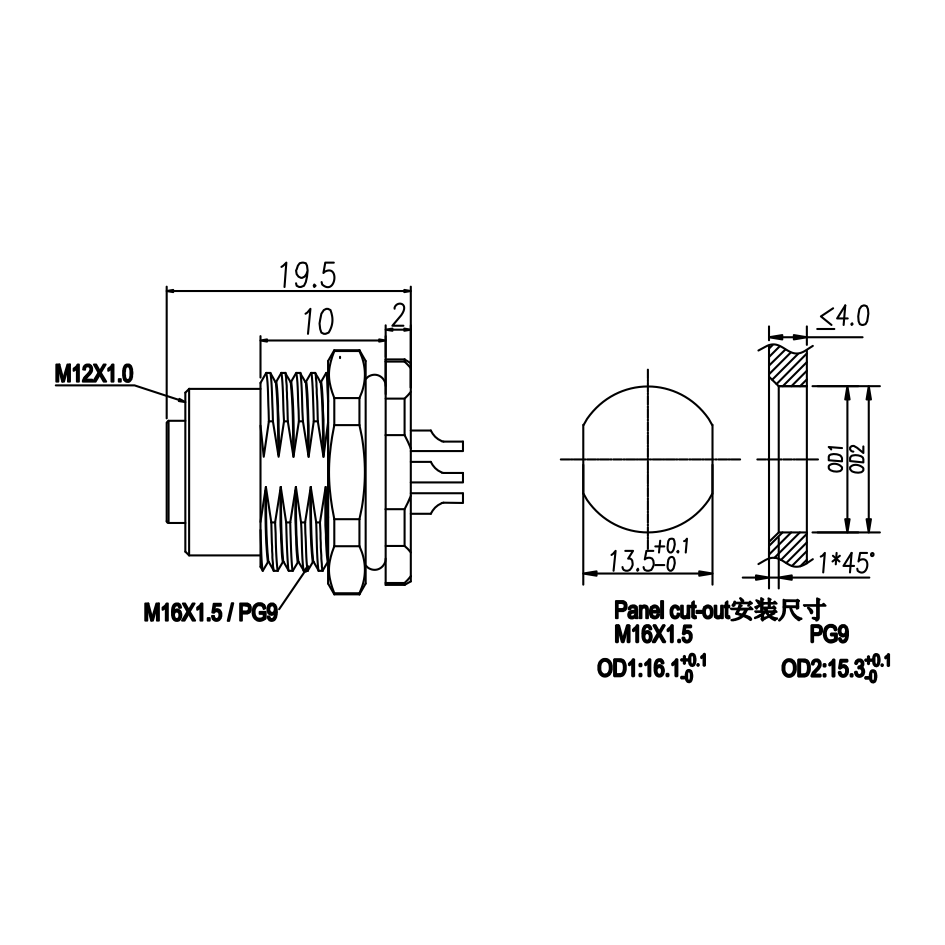 M12 母头面板式,焊接式,前锁安装