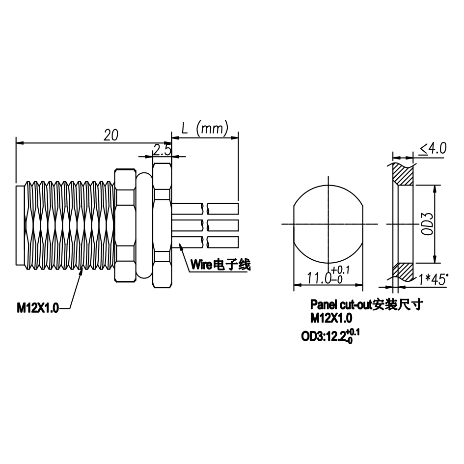 M12 公头面板式,焊接式,前锁安装,焊电子线
