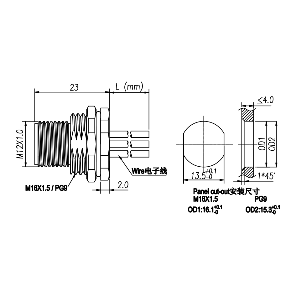M12 公头面板式,焊接式,前锁安装,焊电子线