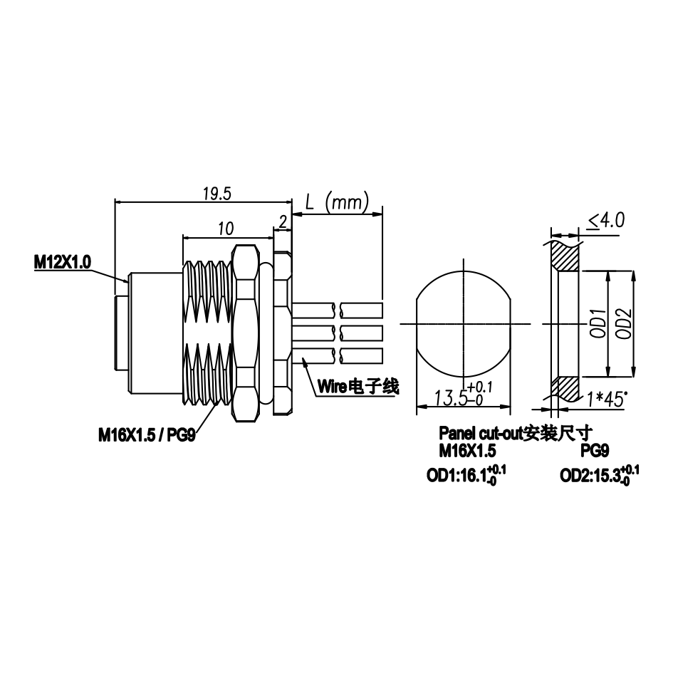 M12 母头面板式,焊接式,前锁安装,焊电子线
