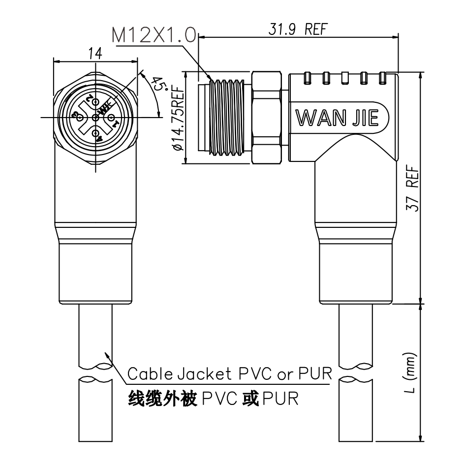 M12 公头成型式线缆,弯头,非屏蔽,不锈钢螺丝